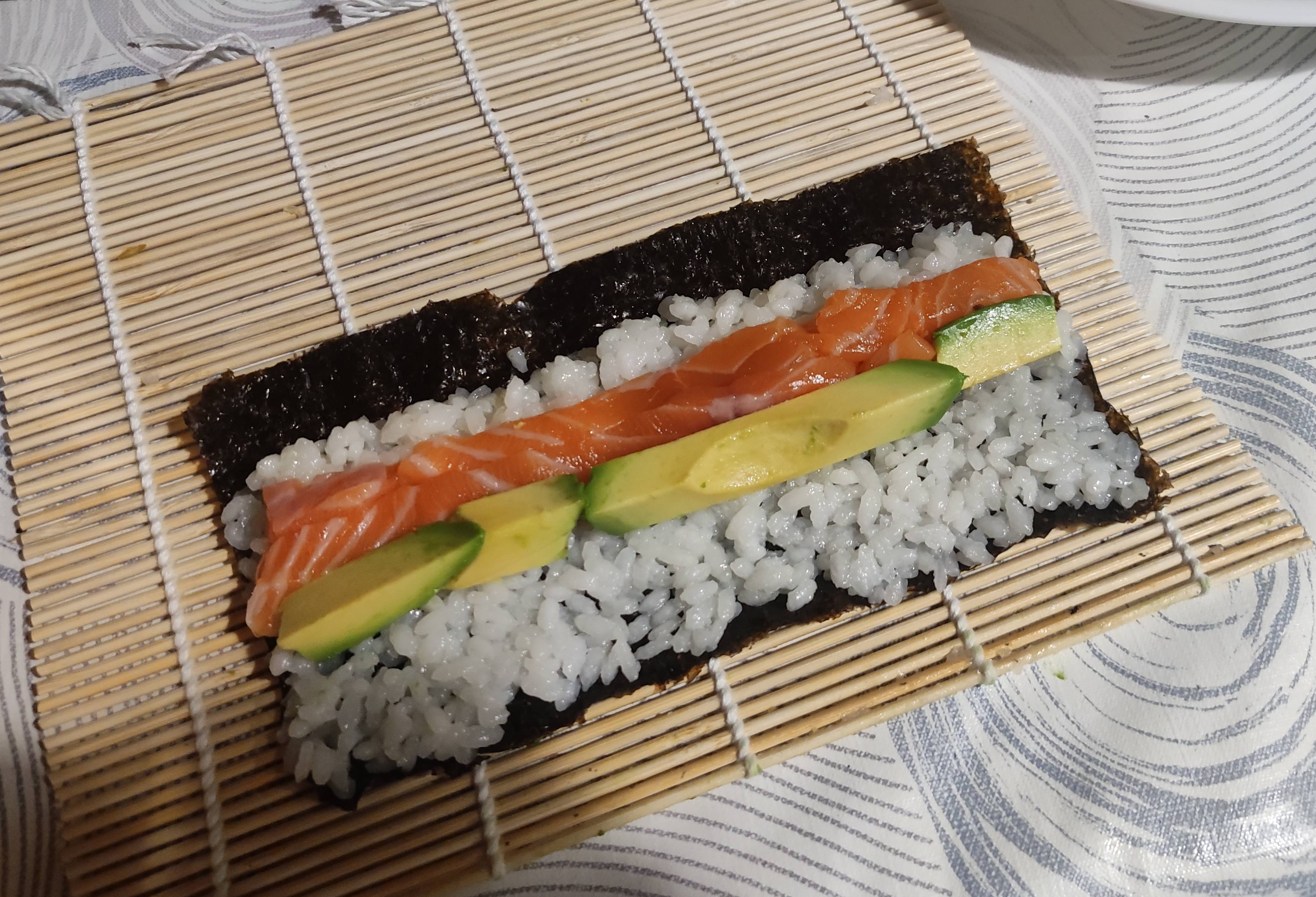 Rouler en serrant bien le rouleau. L'algue doit recouvrir complètement le riz.